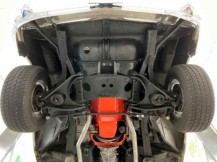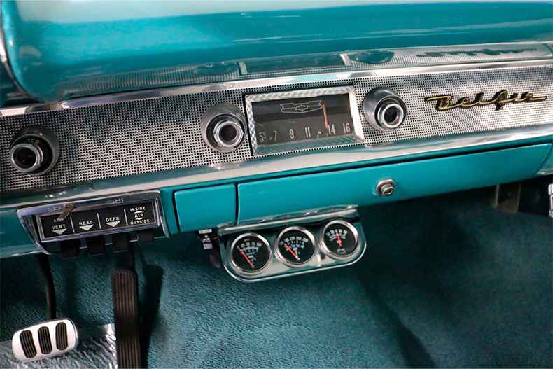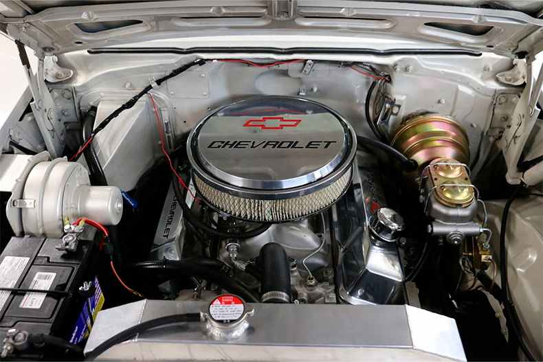 Beneath the gleaming Pearl White Tri-Coat exterior lies a heart of pure power. A 383Ci stroker engine, a testament to meticulous craftsmanship, delivers exhilarating acceleration and a throaty rumble that turns heads. Paired with a smooth-shifting 5-speed manual Tremec transmission, this Bel Air offers an engaging driving experience that is both exhilarating and rewarding.