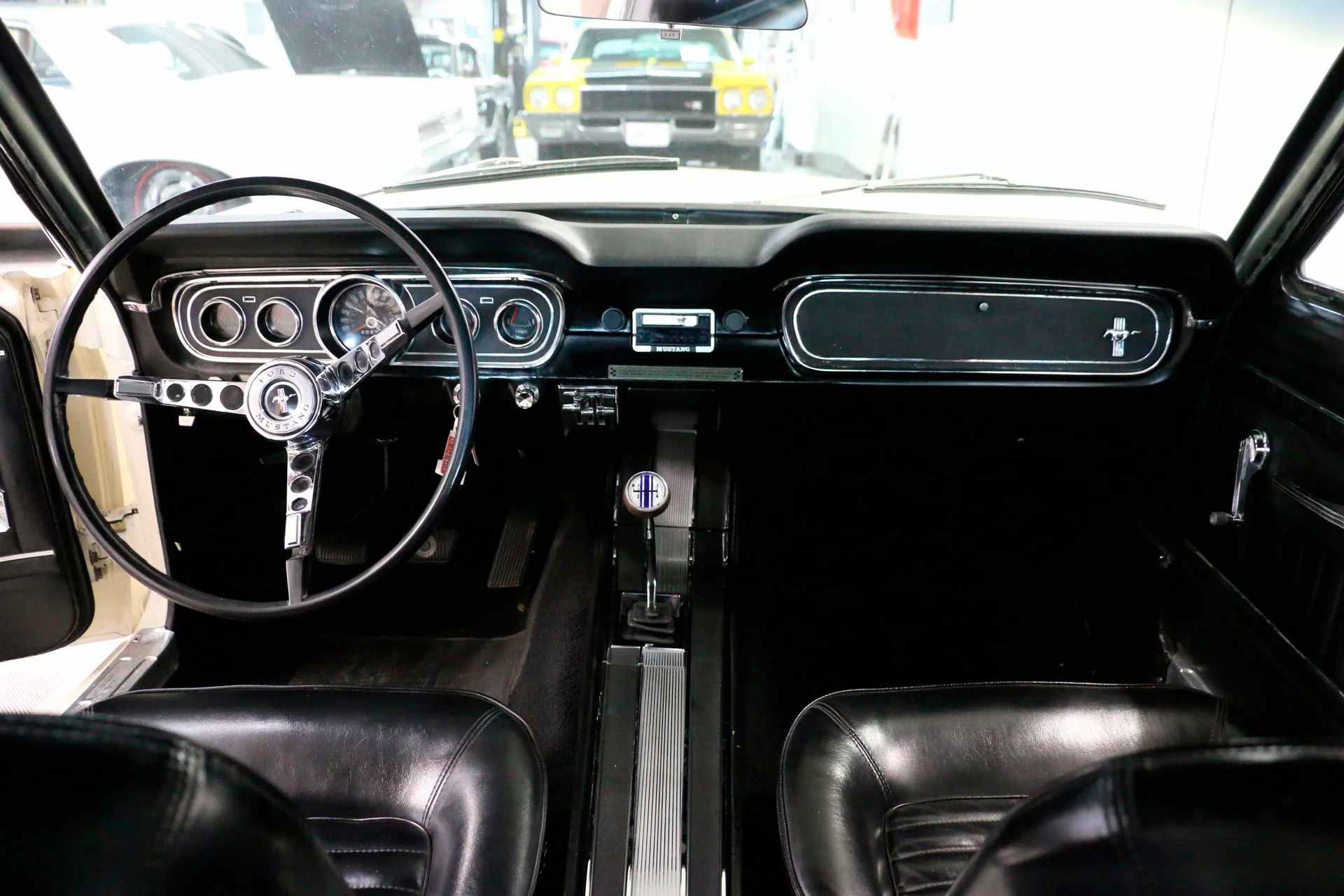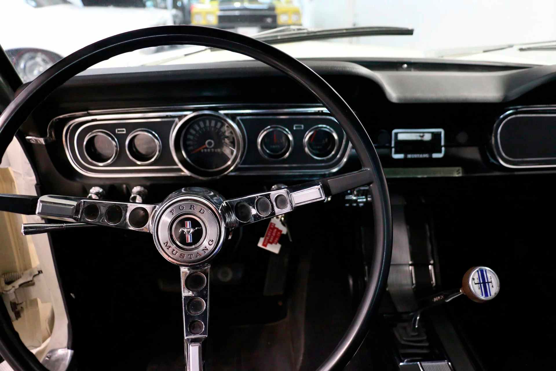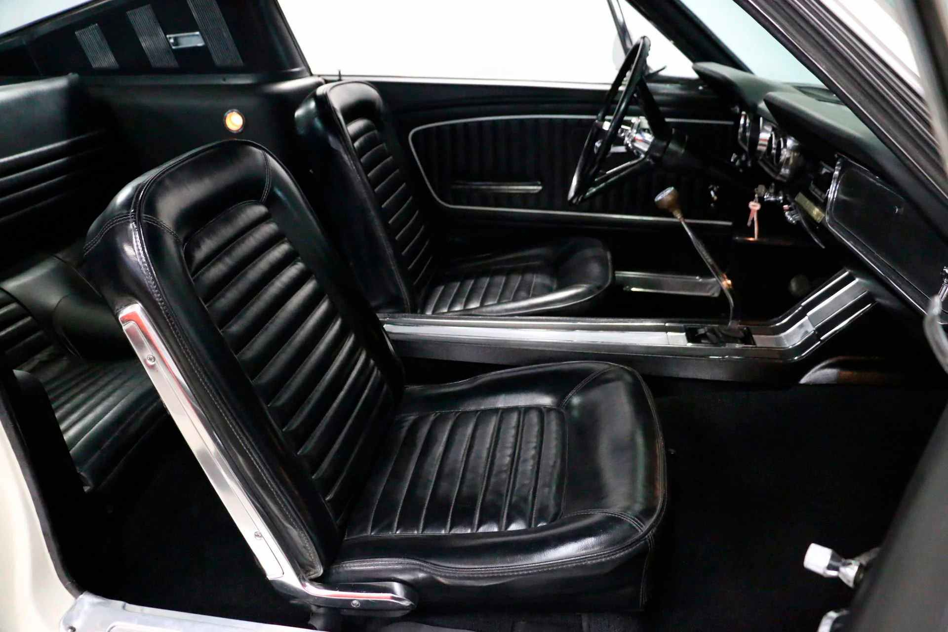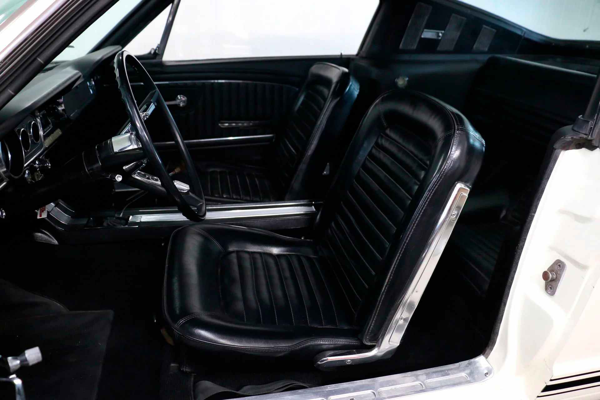 The pristine Wimbledon White exterior, punctuated by the iconic Mustang styling, gleams under the sun, showcasing the timeless elegance of this iconic design. From the graceful lines of the fastback to the distinctive grille and the iconic Mustang emblem, every detail speaks to a period of American automotive design that remains unmatched in its influence. Inside, the black vinyl interior exudes classic sophistication. The bucket seats, sporting a timeless design, offer a comfortable and sporty feel, inviting you to embark on journeys filled with nostalgia and excitement.